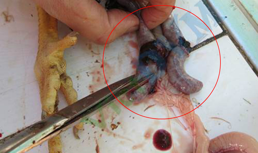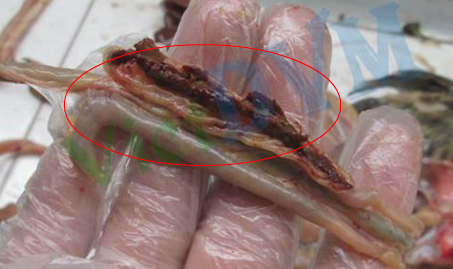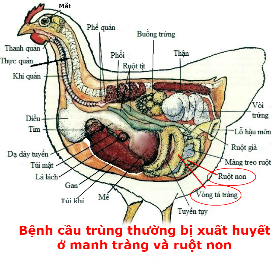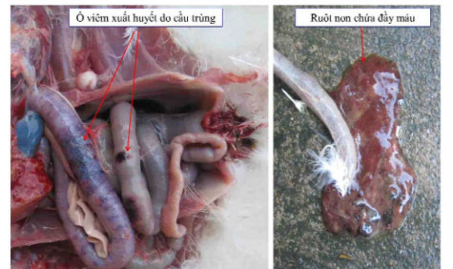 • Khi mổ khám kiểm tra gà bị cầu trùng thì ở 2 mạnh tràng của gà chứa nhiều máu căng phồng, máu sẽ dần dần khô và đóng lại trong manh tràng của gà trong giai đoạn cuối.