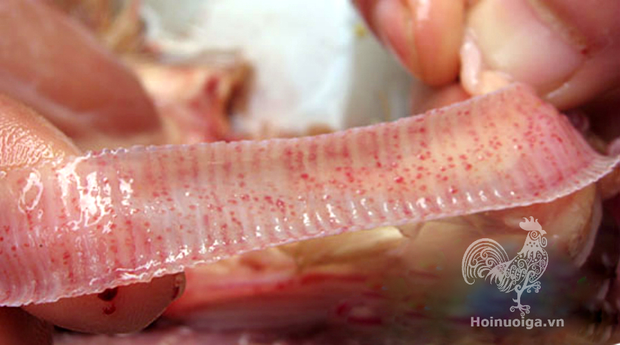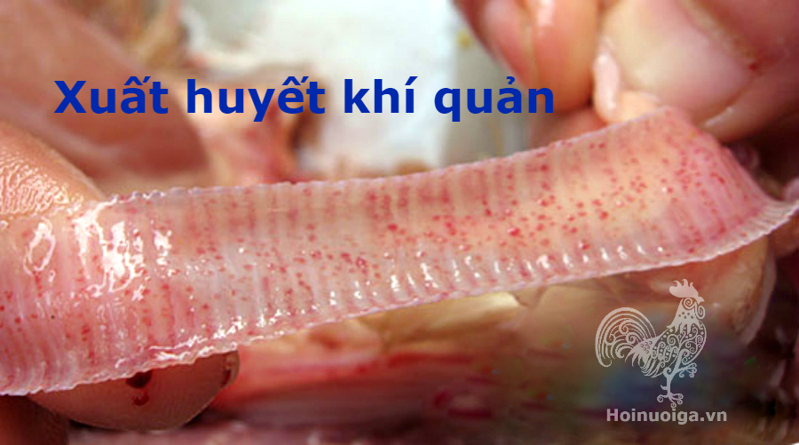 • Khí quản bị viêm, có nốt xuất huyết đỏ, có nhiều đờm dích máu đông, cũng là nguyên nhân khiến gà ngạt thở từng con, bị nặng , xuất huyết nhiều máu sẽ đông làm tắc đường hô hấp cũng khiến gà bị chết.