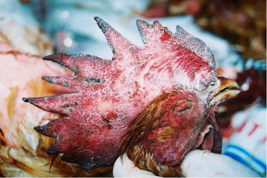 – Mào, tích tím bầm do tụ máu, Khi gà chết thì da tím tái do xuất huyết