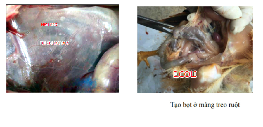 • Màng túi khí có bọt, gân túi khí dầy lên → Gà bị E.coli