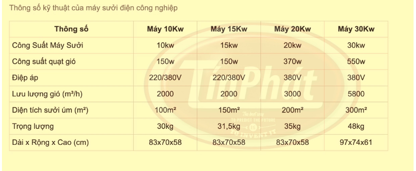 Thông thường, quạt sưởi công nghiệp có các thông số kỹ thuật sau: