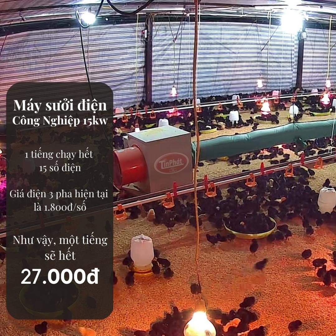 – So sánh với máy sưởi dầu Diesel 30kw, loại có cùng diện tích sử dụng là 150m² như máy sưởi điện 15kw. Máy sưởi dầu chạy 1 tiếng hết khoảng 2,5 lít dầu diesel, với giá dầu hiện tại đang là 22.000đ/lít, tức là 1 tiếng sẽ đốt hết khoảng 55.000đ, vẫn cao hơn gấp đôi so với dùng máy sưởi điện 15kw. Mặt khác khi sử dụng máy sưởi dầu Diesel thường hay đốt cháy oxy và thải ra khí CO2, không tốt cho sức khoẻ của Gà.